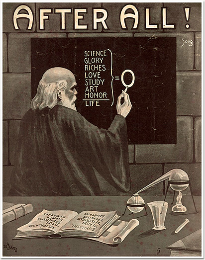 This image cracks me up. More so in context (because it’s not a piece of Nihilist propaganda or some allegorical face smack from a Jack Chick tract.) You might notice that little scribbly “song” written up in the corner… this is in fact a cover illustration for a piece of sheet music published in 1909. I can’t help but think of it as the equivalent of a “megadeth cover” for its time, except you just know the music inside is all jaunty and “23 skidoo” and “tennis, anyone?”