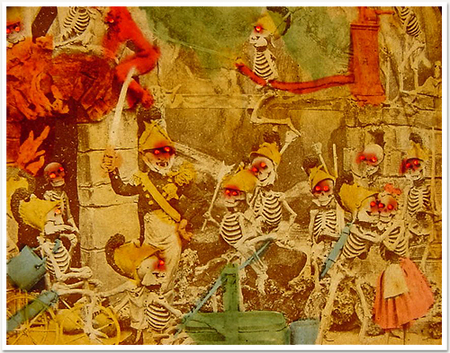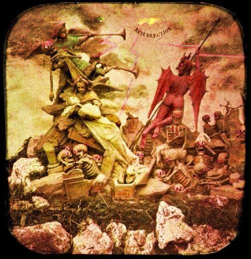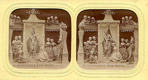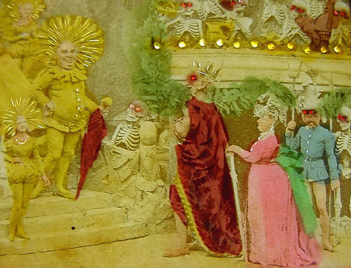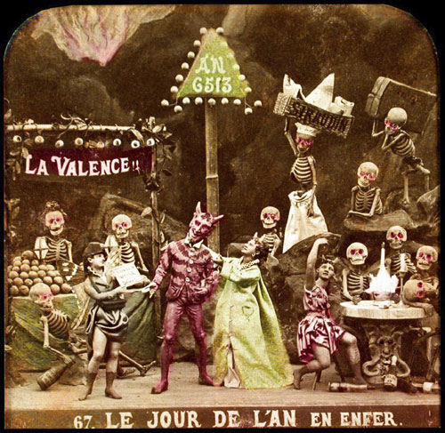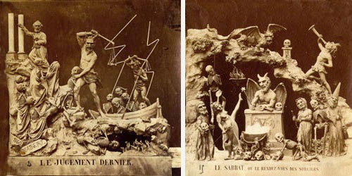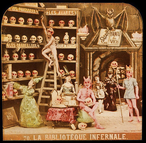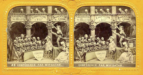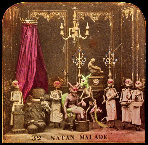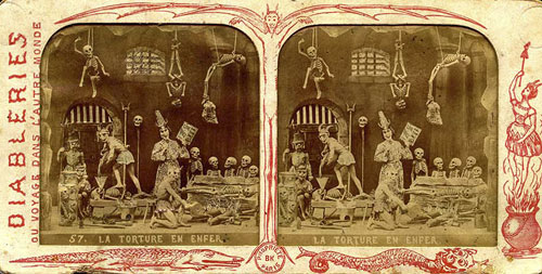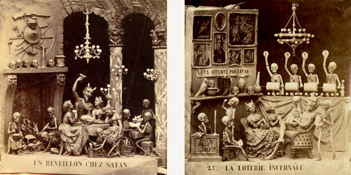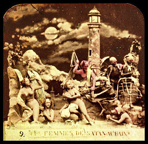 Their history, method of creation, and purpose are largely a matter of speculation. They originate from some time in the 19th century and are French. They were created by only a handful (perhaps 2 or 3) artists. It seems they were photographed from small clay dioramas, none of which have survived. They were presented as opaque stereo-photographs and transparent rear-projection tissues, some hand colored (as above) some a rich sepia. The mystery surrounding their origins was likely intentional in that there content, humorous and bawdy and dealing almost exclusively with satan, hell, and the dead, would likely be seen as heretical. The present thinking is that they were produced as social satire on the regime of Louis Napoleon Bonaparte who, as Napoleon III, was Emperor of France from 1852 to 1870. The relative anonymity of the creators and mystery of their origins would serve as protection against imprisonment and other dungeon-related unpleasantness. See below for a few scant examples and links to more complete resources.