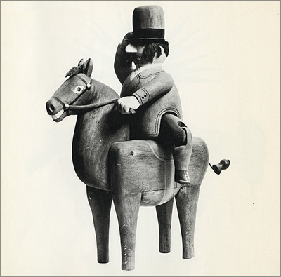 Man On Horse, polychrome wood, 16” high. Crank tail; horse bobs head back and forth; rider posts up and down in counter-rhythm.