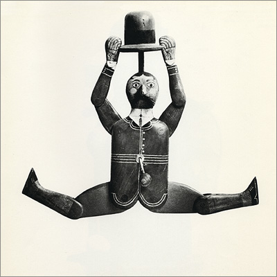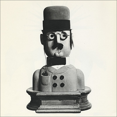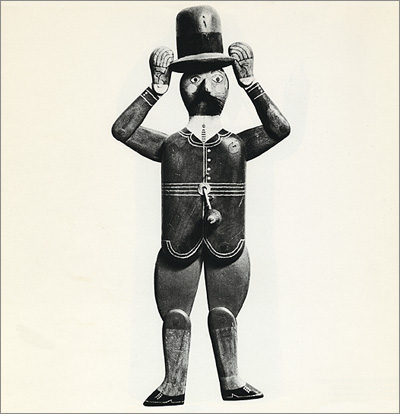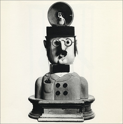 Man And Bird, polychrome wood, 23” high. Eyes cross when left ear is turned; pull nose and tongue sticks out; turn right ear and hat pops open, bird jumps out and chirps.