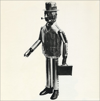 Made a pit-stop yesterday, on my way home from the grind, at the Strand bookstore. Picked up many goodies as always. Among the haul was a little book which I thought was pretty nifty and wanted to share straight away. As you can see from the cover reproduced above It’s called Objects. It’s a thin volume, put out in 1969, featuring some of the statues, banks, and other objects created by illustrator Walter Einsel. A google search on Einsel revealed little except for the fact he passed away not too long ago, is survived by his illustrator wife Naiad, and that, evidently, I’ve posted his work here before. In any case see below for a sampling of Einsel’s groovy moving sculptures.