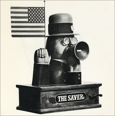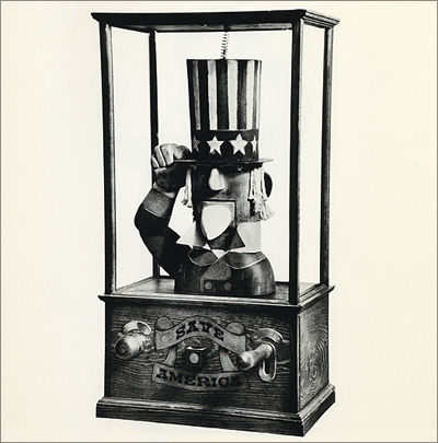 Save America, polychrome wood, 28” high. Deposit coin, pull knob. push plunger; Unvle Sam raises hat, opens mouth; printed on tongue: “Thank You.”