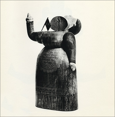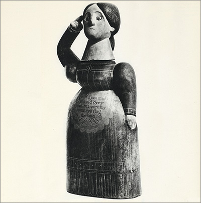 Barbara Frietchie, polychrome wood, 16” high. When arm is pulled down, head drops back, flag goes up, music box in bosom plays Stars and Stripes Forever. Text on apron reads: “Shoot- if you must this old grey head, but spare my country’s flag, she said.”