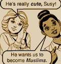 right away. luckily she’s not too late to save her friends though. she breaks the news that mohammed was a slave owning, moon god worshiping, pedophilic scumbag then proceeds to tell them all about the true god jesus christ. wheeew! that was a close one, those two young children almost fell prey to an evangelizing religious zealot! good thing amir didn’t have any muslim propaganda done in a style traditionally aimed at children! thank you st. chick.