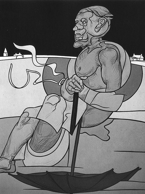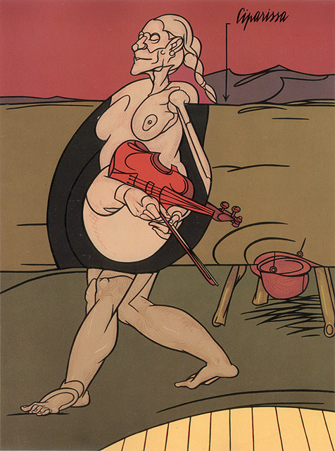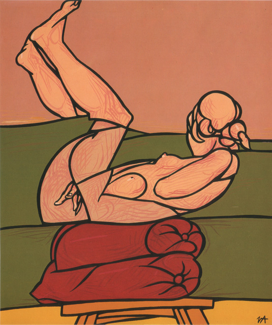 the deconstructing lichtenstein thing recently resurfaced over at drawn! which got me thinking about pop-art… mainly how i never much liked any of the artists i’d come across who were crammed into that category… with one glaring exception that is: valerio adami. (though to be honest i never really thought of him in terms of a pop-art.) “who?” you ask. he’s an italian artist who came up in the 50’s, made a decent sized splash in the 70’s, and who today is most likely to be filed under the “one of the most talented artists no one’s ever heard of” category, which is unfortunate, especially considering how relevant his style would seem in today’s circles, if not his subject matter.