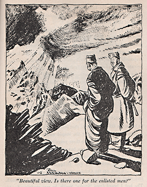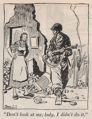 site member tbuckner was kind enough to send me a wonderful, hardback, 1945 edition of a book called up front by a recently deceased cartoonist named bill mauldin. the book is about the infantry in world war two, in which maudlin served. he offers lot’s of insight into the life and days of an infantryman, but as he states himself, “my business is drawing, not writing, and the text is pretty much background for the drawings.” and it’s chock full of his evocative and funny/sad one panel comics. i thought i’d share a few of them with everyone