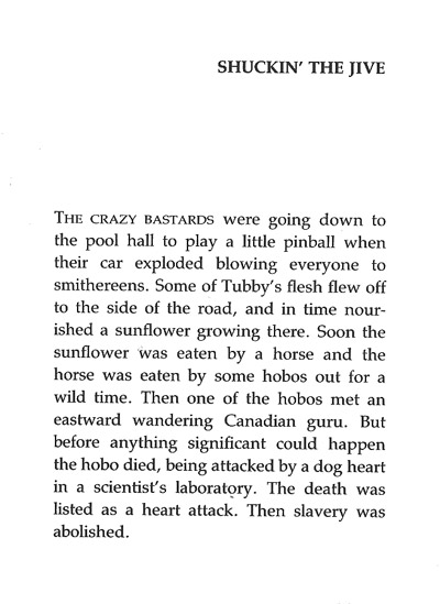 today’s topic: spam. the bad followed by the good. first the bad- the nonist’s url was spoofed by a spammer somewhere so if you have received any emails trying to sell you pharmaceuticals or raising the alarm over bird flu i apologize, but rest assured it was not from us. second the good- last week i received two bits of mail, undeniably spam, which never the less caught my eye. at the top of each message was the usual junk, but in each, after a short bit of blank space, the message continued with a large block of text which to my -highly- developed ear sounded uncannily like dada poetry. the first thing that sprung to mind was that fortune cookie which reads: “help me i’m trapped in a fortune cookie factory.” was this a creative cry for help?