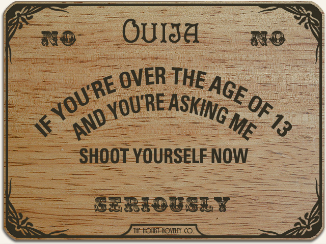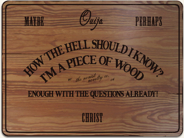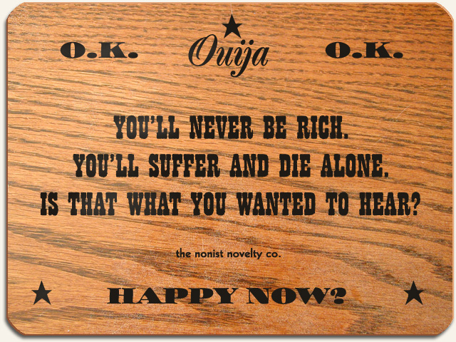 here’s an oldie but goody. the museum of talking boards. like band-aids they are better known today by a brand name- ouija boards. the site has a fantastic little gallery as well as some good ol’ factual history, delving a bit into the victorian fascination with spiritualism which fostered the board’s spread. there are some bits about its precursors the psychograph and planchette and many period descriptions. very cool. meanwhile i figured i’d take this opportunity to unveil three new ouija boards which, assuming the venture capital materializes, will be hitting the market later this year, created by the nonist novelty co. see below.
