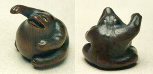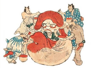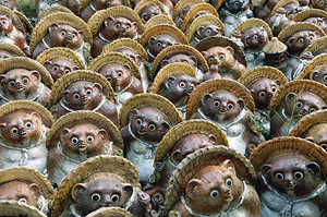from the shinto and buddhist corner: A curious and defining characteristic of Tanuki is its gigantic testes. According to some legends, the testicles / scrotum can be stretched to the size of eight tatami mats. Others point to the word Senjojiki (the space of 1,000 tatami mats) as an indication of the Tanuki’s testes size. Called Kin-tama (Golden Balls) in Japanese, the testes are supposedly symbols of good luck rather than overt sexual symbols (the Japanese are more tolerant of low humor than most Western nations). In the movie Heisei Tanuki Gassen Ponpoko, the Tanuki stretches out its scrotum as a parachute in a desperate suicide attack. In other Tanuki folklore, the Tanuki uses the testes as an impromptu drum, beating out the “ponpoko” sound (no pun intended).