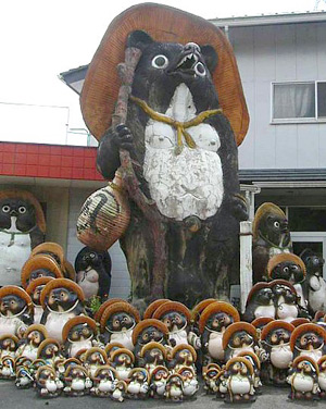 evidently tanuki are very prominent in Japanese folklore and proverbs and to this day the tanuki is thought of as the God of Gluttony, Boozing, and Restauranteurs, which accounts for the tanuki statues outside of restaurants and bars, where it “beckons drinkers and dinners to enter.”