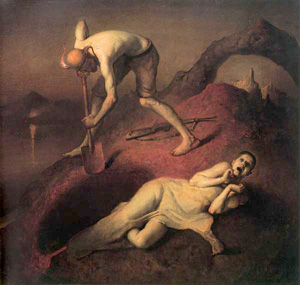 nerdrum’s work, if you are not familiar with it, is created in the manner of “the old masters” (he mixes and grinds his own pigments, stretches his canvas, and uses live models exclusively) with emphasis on chiaroscuro, and are not only exclusively figurative but very often allegorical as well. they are filled with agony, disease, violence; some show necrophilia, hermaphroditism, coprophilia, etc. often there is a sense you’re witnessing some cult ceremony. in short they are beautiful paintings of a kind and of subjects you don’t see too often anymore. at least that’s what my gut has told me.