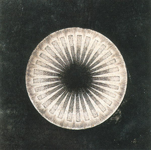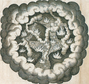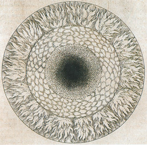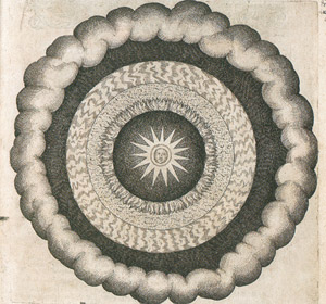 in the centre are the dark waters, far from light, forming the source of matter; at the edge are the upper waters, from which the divine fiery heaven will unfold. the bright cloud in between is called the earth spirit.
