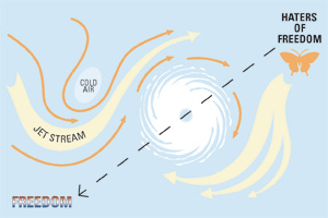 unbeknownst to all but his closest handlers bush began an inquiry into these hurricanes. once he established that lorenz’s idea was sound he charged his science advisors to track the possible source of all hurricanes which hit america in the last 4 and a half years. they took to the task with vigor, by our sources’ account reading more goat entrails and praying harder than they had since their evidence gathering mission for collin powell’s anthrax presentation. within 6 months they hit pay dirt. their findings confirmed exactly what bush had suspected. a secret lepidary located somewhere within the borders of iran was almost certainly the source of every hurricane in the last 4 and a half years! incredible!