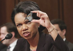 plans are moving forward quickly now. bullet point packets have been sent to all high level republicans and pundits. top notch power point presentations are being put together. paper trails for butterfly larva purchases are being gathered. banners are being printed. think we are kidding? well think again. our source supplied us with this exclusive photo of condoleeza rice prepping for her imminent address to the u.n. security council.